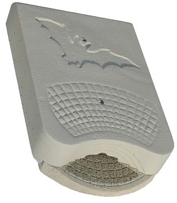 Dieser Einbaustein eignet sich durch seine spezielle Isolierung sowohl im Winter wie auch im Sommer als Quartier für gebäudebewohnende Fledermausarten. Das Quartier ist durch das patentierte Doppelwand- System dabei vollkommen wintertauglich - das gleiche System wird übrigens schon seit vielen Jahren sehr erfolgreich in unserer Fledermaus- Überwinterungshöhlen vom Typ 1FW für den Forstbereich eingesetzt. Mit dem 1WI steht ein Ganzjahresquartier zur einfachen und kostengünstigen Integration in Bauwerks- Außenwände zur Verfügung, zur sicheren Kolonie- und Wochenstubenbildung im Sommer sowie für den sicheren Winterschlaf der Tiere geeignet. Wartung: Selbstreinigend und somit wartungsfrei. Innenseite: Verschiedene Oberflächenstrukturen in unterschiedlichen Hangtiefen; dies hat nicht nur klimatische Vorteile, sondern hilft auch den einzelnen Arten einen für sie geeigneten Hangplatz zu finden. Außenseite: Der trichterförmige Anflugbereich bietet mit seinen Treppchen den Tieren gute Ankrallmöglichkeiten und beschleunigt damit die Annahme, z.B. auch für unerfahrene Jungtiere. |